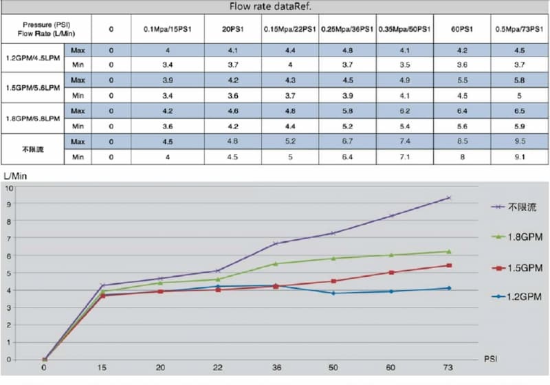 Flow rate can choose from 1.2GPM, 1.5GPM, 1.8GPM and free flow rate, detail flow rate data can refer as below: