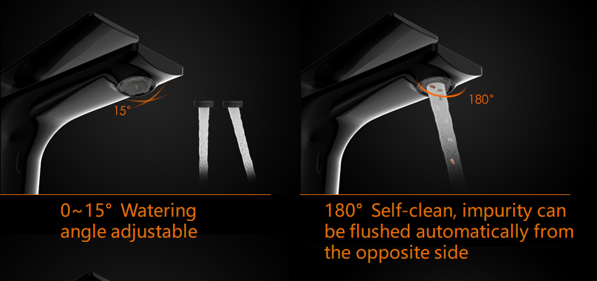 Reverse the outlet panel can have 15°watering angle adjustment, can adjust the watering drop point forward to avoid of splashing on the back part of the basin, offering better washing experience